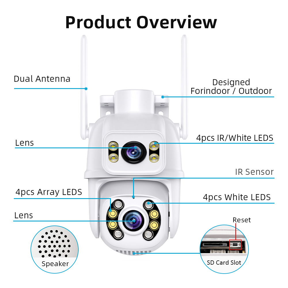 • Upgrade your home security with this powerful Dual Lens 4K PTZ Wireless IP Camera. Designed for full outdoor protection, this smart CCTV camera delivers ultra-clear footage, intelligent tracking, and 360° coverage — all controlled directly from your smartphone via the iCSee app.